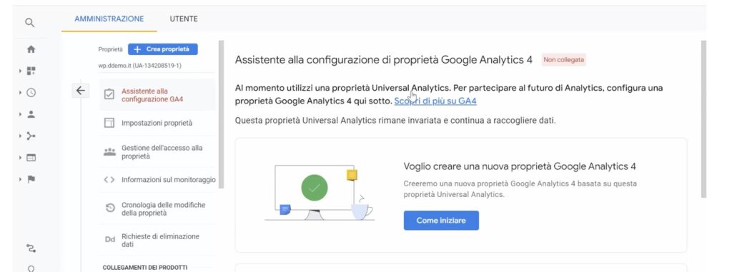 In amministrazione seleziona l’account –> clicca aggiungi propieta e Clicca su ” Assistente alla Creazione della Propieta Google Analytics 4″
